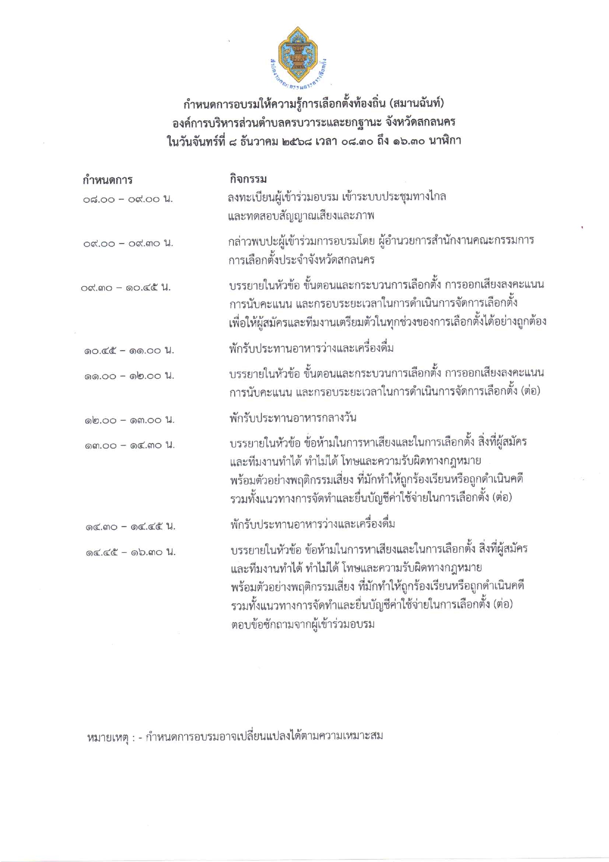 กำหนดการอบรมสมานฉันท์การเลือกตั้ง อบต. วันจันทร์ที...