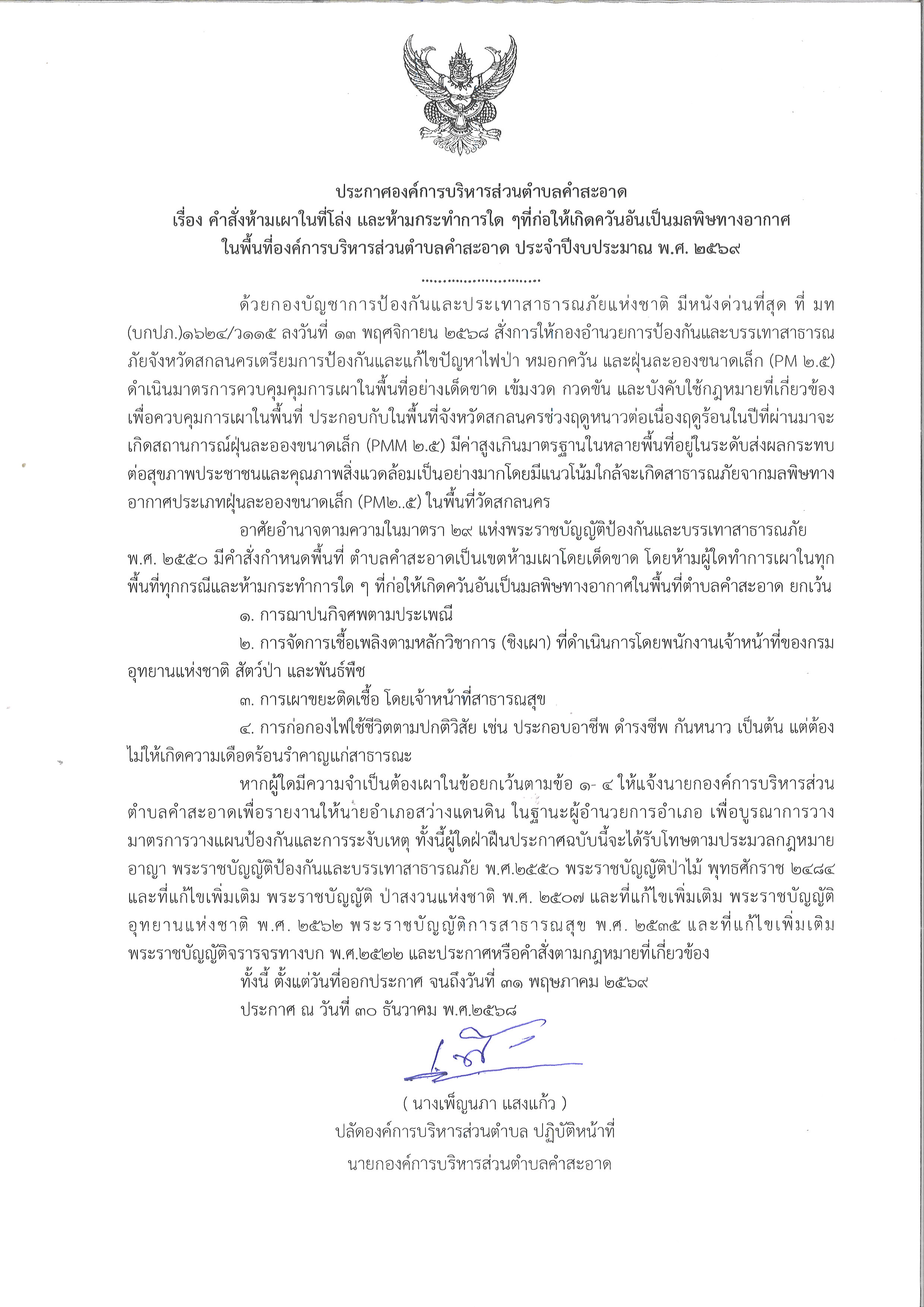 ประกาศองค์การบริหารส่วนตำบลคำสะอาด เรื่อง คำสั่งห้...